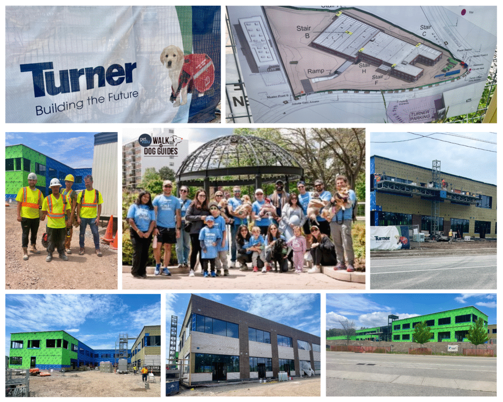 clockwise from top left: Turner sign on the exterior wall with an image of a yellow lab puppy in an oversized red jacket , huge plan of the building for workers reference, East view mid-June with the Brickwork in progress, West view of the building, East view at the end of June with the Brickwork complete, view from the front and the crew leaving after a hot day at work.