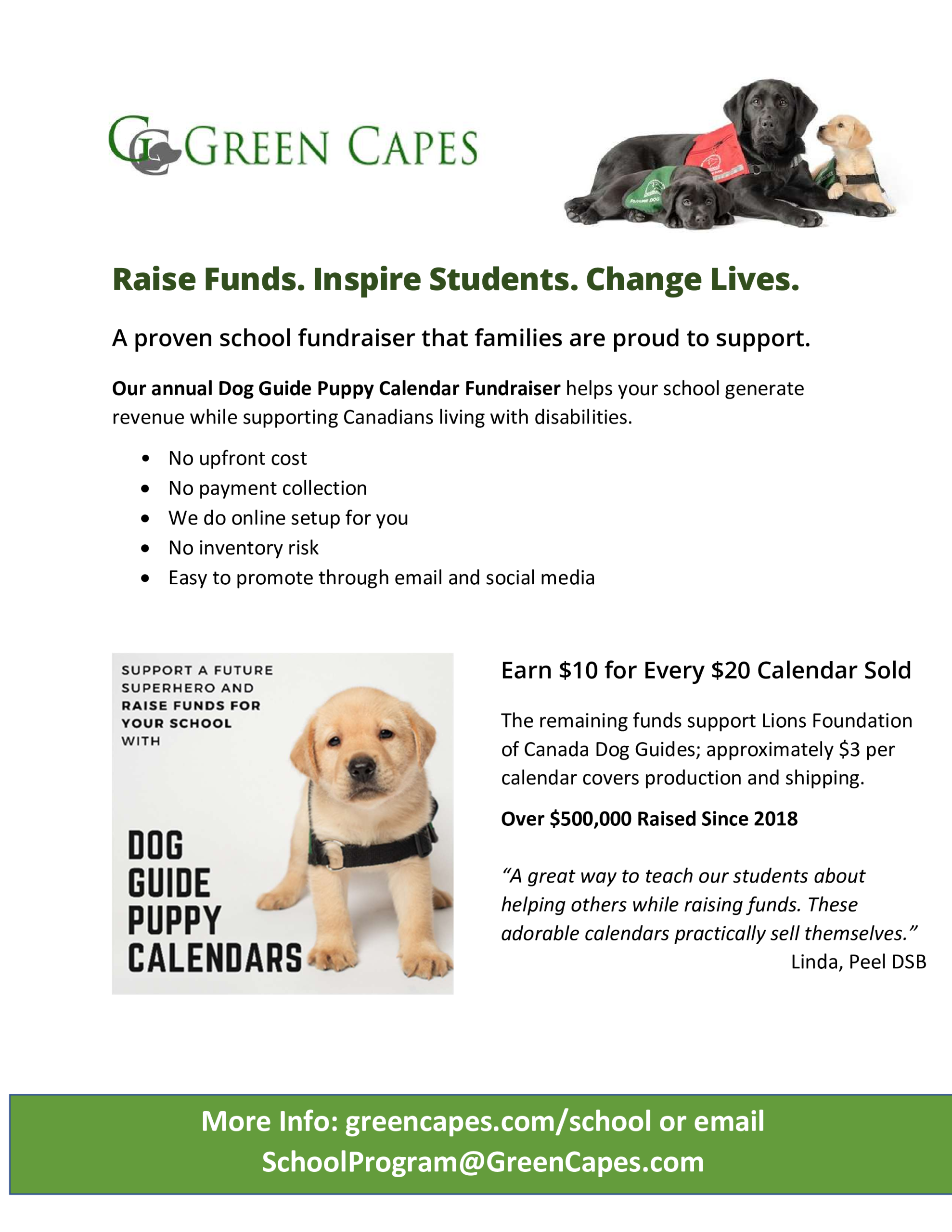 Would your school like to raise money and support the Lions Foundation of Canada Dog Guides in their mission to provide service dogs free of charge to Canadians with medical or physical disabilities? We have a proven fundraiser you will love. Green Capes has been producing and partnering with non-profits to sell these beautiful calendars since 2018 and would like to invite your school to join us.